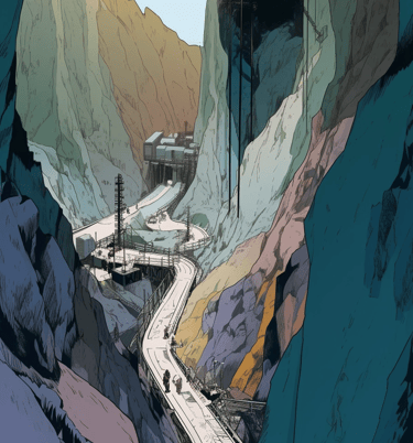 The Gorge of Echoes: A testament to industry's roar, this gorge whispers the legacy of those who've shaped the Range's heart.